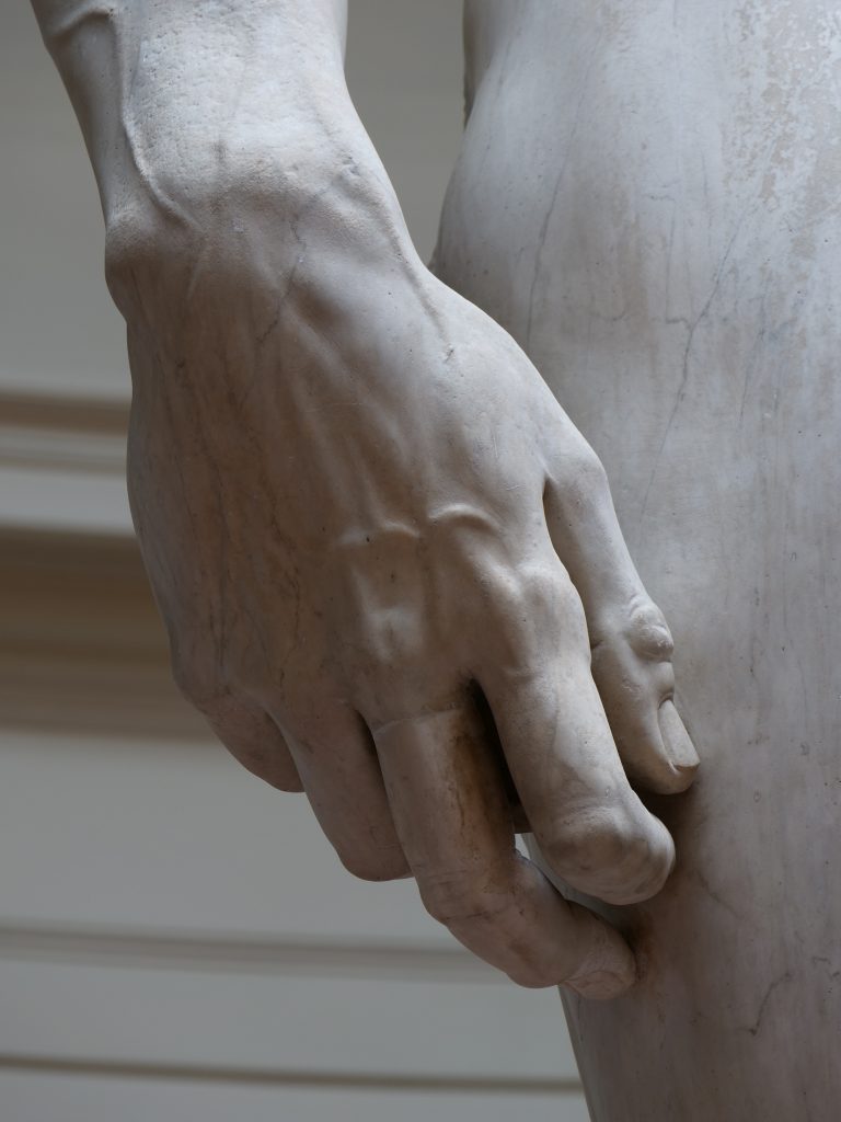 His right hand grips the end of the sling, while his left arm is tensed. His neck and flared nostrils show physical strain. You can even see a slight grimace of contempt on his lips, aimed at Goliath. Michelangelo studied cadavers: the anatomy is precise, though sometimes exaggerated to heighten the drama. Just look at the left wrist, where a muscle is visible that would normally only show if the pinky were raised—which it isn’t.